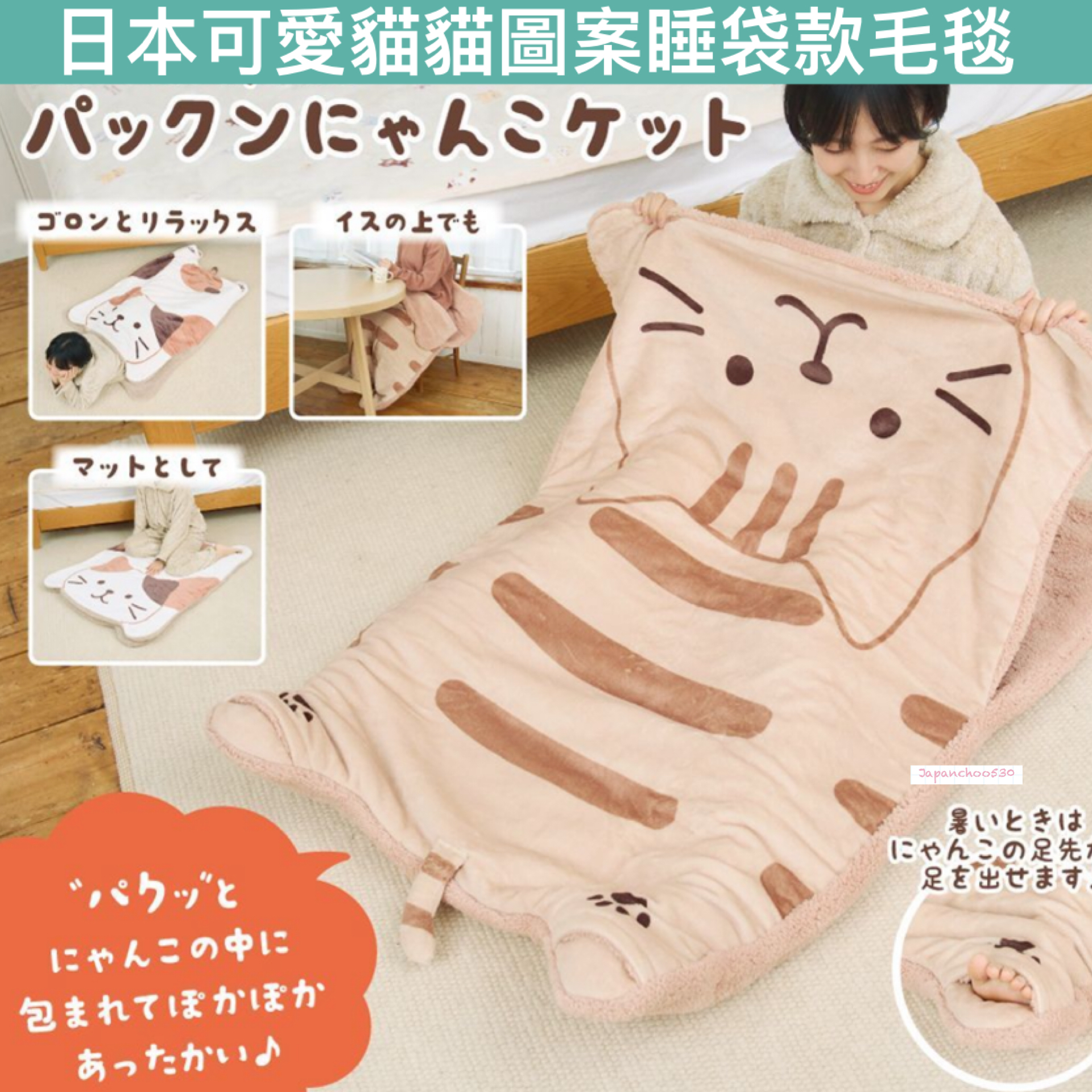 日本預訂📍日本可愛貓貓圖案睡袋款毛毯 不包郵