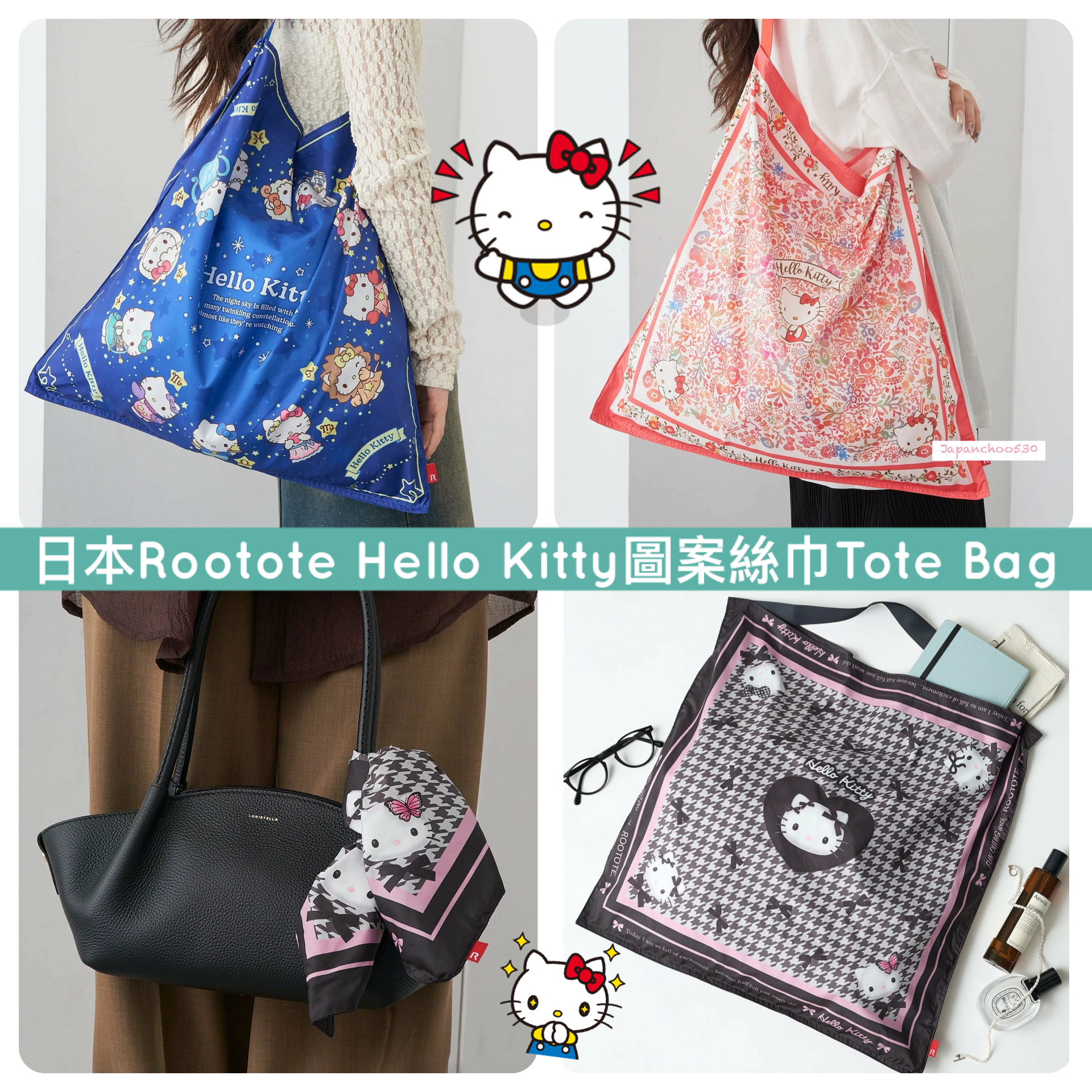 日本預訂📍日本Rootote x Hello Kitty圖案絲巾Tote Bag